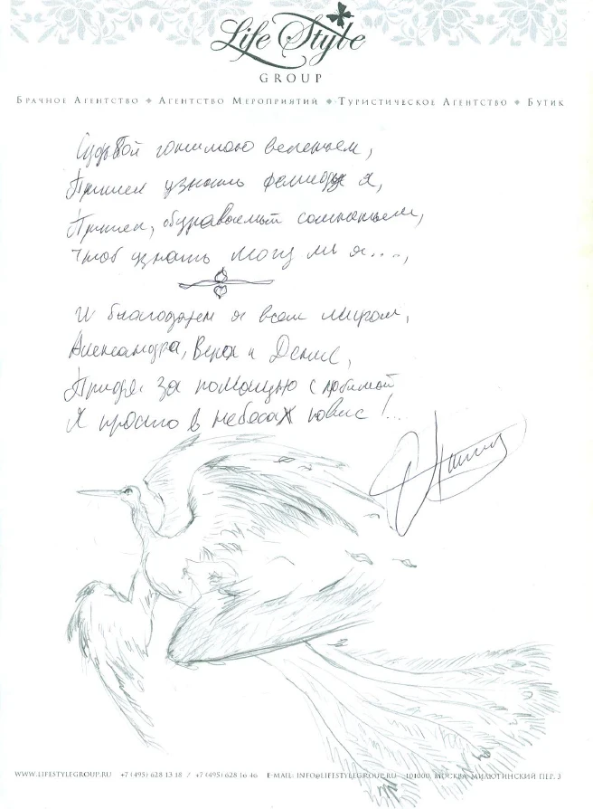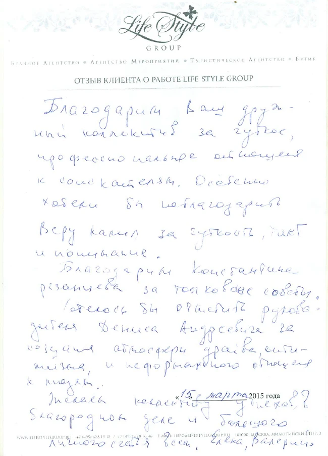 Life Style Group – современная компания свадебной индустрии, отличающаяся от существующих служб знакомств и брачных агентств, собственными эффективными методиками и технологиями, созданными на основе российского и международного опыта в области семейной психологии и коучинга, детальным анализом запросов каждого Клиента и современного рынка услуг, регулярным контролем качества и динамичностью, а также строгой приверженностью к высокими стандартам сервиса, которые позволяют нам быть впереди и превосходить ожидания Клиентов!